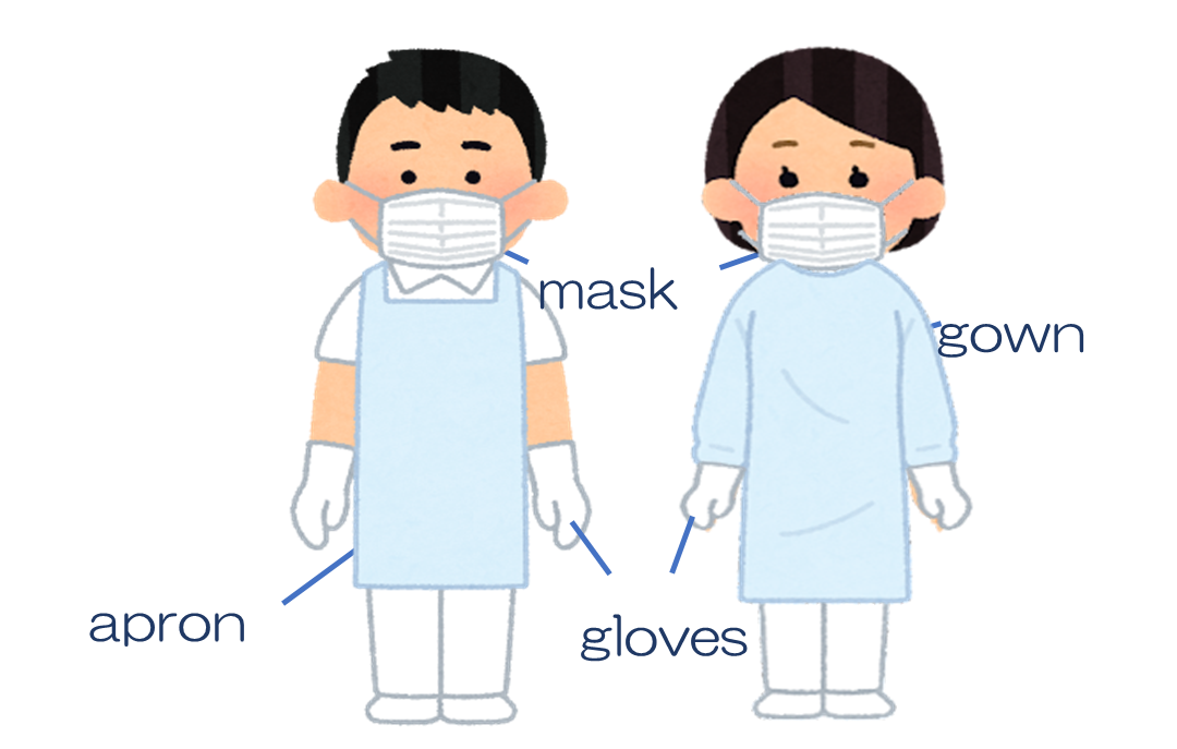 Masks, aprons, gowns, and gloves are worn when caring for a person suffering from an infectious disease, when changing diapers, etc.